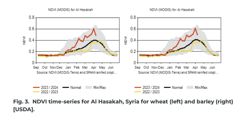 Leveraging remote sensing technology and proprietary machine learning models, Agrograph identified the total small grains planted acres for the 2023-2024 growing season within Iraq and Syria. The resulting crop maps were compared with the harvested area data from previous years reported by FAOSTATS and the USDA International Production Assessment Division (IPAD).
