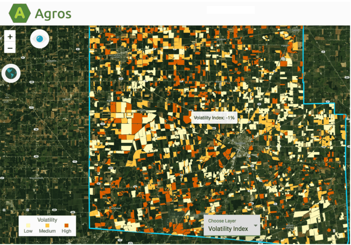 Agrograph works with several major agriculture lenders to assist with farm-loan portfolio management. Its Volatility Index compares risk across a financial company’s loan portfolio, providing insight into customer fields. Combining this index with Agrograph’s gross revenue tool allows lenders to forecast potential losses for high-risk and emergent loans throughout the growing season rather than retrospectively at the end of the season.