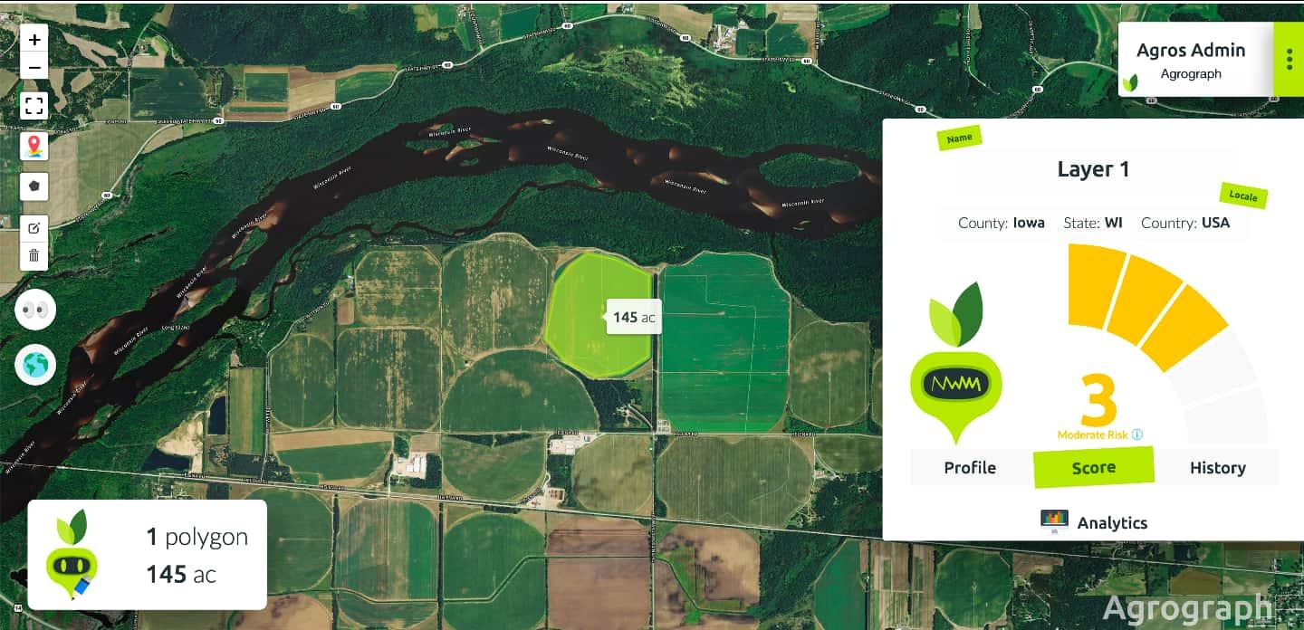 The Agros® Score provides a standardized farm-to-farm creditworthiness rating ranging from one to five. Creditworthiness is determined by analyzing field-level data including land use, crop yields, and market demand among many other scientifically validated environmental factors.